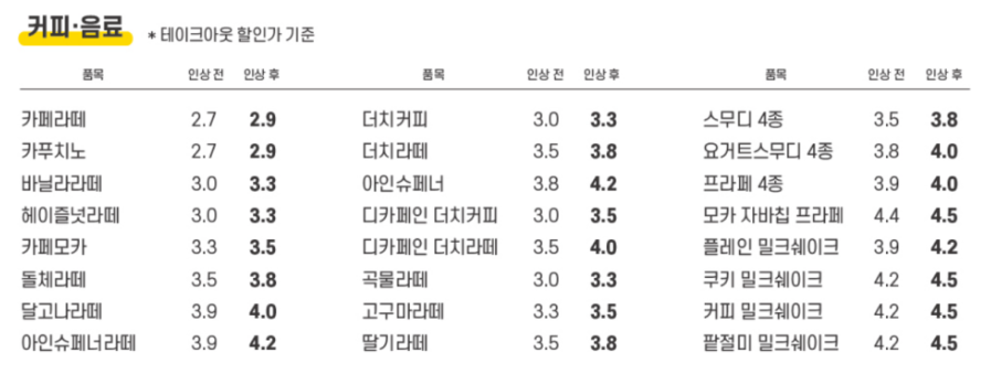 마지막으로 아래 인상 전과 인상후 메뉴의 가격표입니다. 물론 위의 표들은 최신 인상된 가격이 반영되어 있습니다. 얼마나 인상되었는지만 참고하시기 바랍니다.